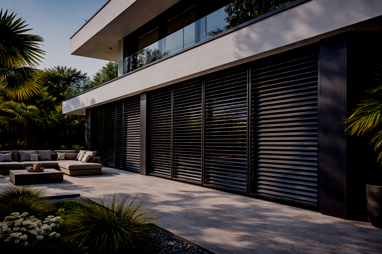Motorised vertical shutter systems provide modern solar protection while maintaining natural light and outdoor visibility.